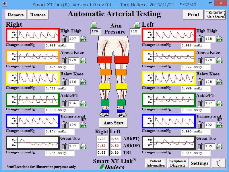 - One button operation for up to either 14-site or 6-site automatic blood pressure measurements by oscillometry & PPG for ABI and TBI.